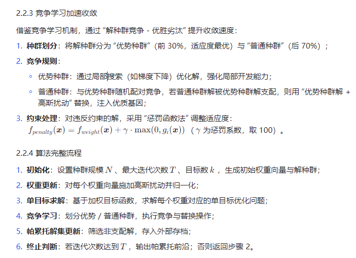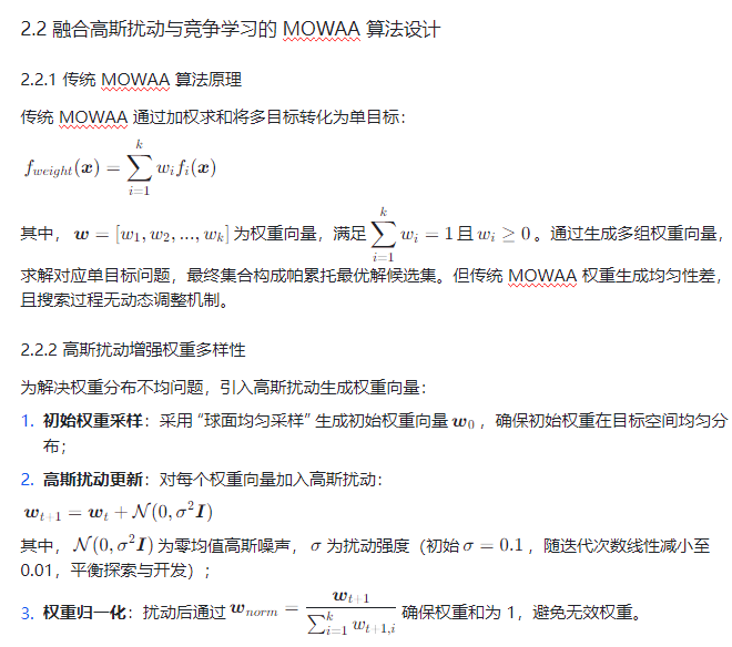 多目标加权平均算法(MOWAA)通过 “权重分配 - 单目标转化” 机制简化多目标优化,但传统 MOWAA 存在两大局限:一是权重生成依赖均匀采样,易导致解分布不均;二是搜索过程缺乏动态调整能力,难以适应复杂解空间。为此,本文提出融合高斯扰动与竞争学习的 MOWAA 算法:通过高斯扰动增强权重多样性与搜索随机性,避免解集聚;通过竞争学习模拟 “适者生存” 机制,加速收敛至帕累托前沿。