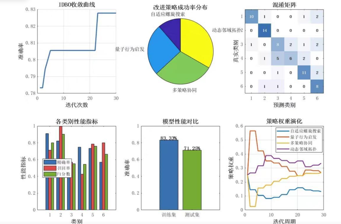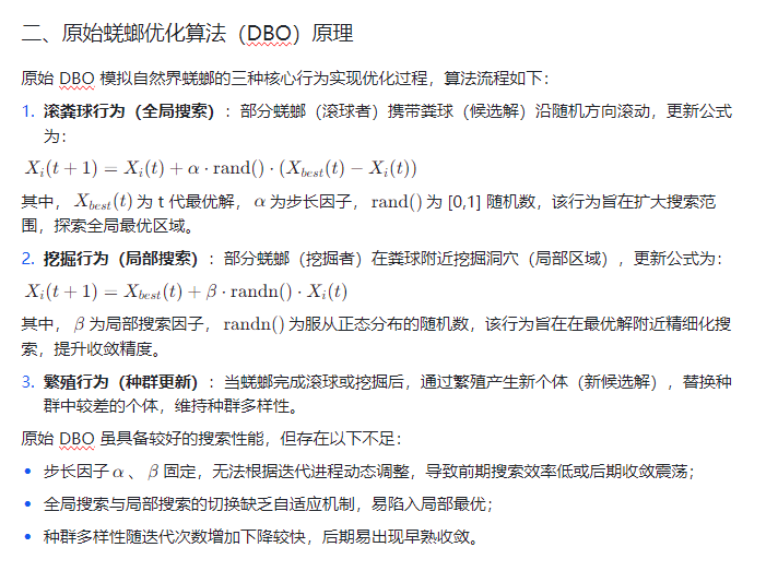 蜣螂优化算法(Dung Beetle Optimization Algorithm,DBO)是受自然界蜣螂滚粪球、挖掘和繁殖行为启发提出的新型群智能优化算法,具有收敛速度快、全局搜索能力强的特点。但原始 DBO 在处理复杂优化问题时,仍存在后期收敛精度不足、易出现早熟收敛的缺陷。为此,本文提出引入四种先进优化策略对 DBO 进行改进(记为 IDBO),并将其用于 SVM 多分类模型的
