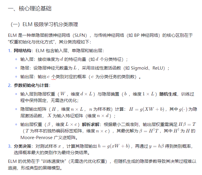 在机器学习分类任务中,极限学习机(Extreme Learning Machine,ELM)凭借 “单隐层结构、随机初始化输入层到隐层权重、仅需优化输出层权重” 的独特优势,展现出极快的训练速度,同时在小样本、高维数据场景(如故障诊断、图像识别、生物信息分类)中保持优异的泛化能力,成为近年来分类任务的热门模型之一。