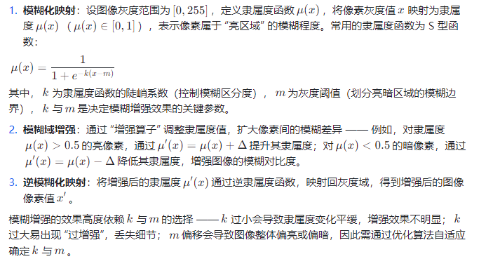 模糊图像增强的核心是 “将图像像素的灰度值映射到模糊域,通过调整隶属度函数增强像素间的模糊差异,再逆映射回灰度域”,具体流程如下: