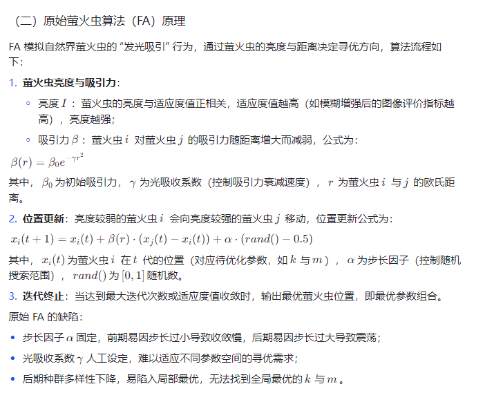 模糊理论通过 “隶属度函数” 描述图像像素的模糊特性,能有效处理遥感图像中的不确定性信息,是图像增强的重要工具。传统模糊图像增强方法(如模糊直方图均衡化)依赖人工设计隶属度函数参数,难以适应不同场景的农业遥感图像;而萤火虫算法(Firefly Algorithm,FA)作为一种群智能优化算法,虽能通过模拟萤火虫发光特性实现参数寻优,但原始 FA 存在收敛速度慢、后期易陷入局部最优的缺陷,无法高效优化模糊增强模型的关键参数。