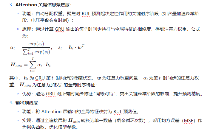 组合模型针对锂电池时序数据的特性,采用 “特征提取 - 时序建模 - 关键聚焦” 的递进式架构,各模块功能与协同逻辑如下: