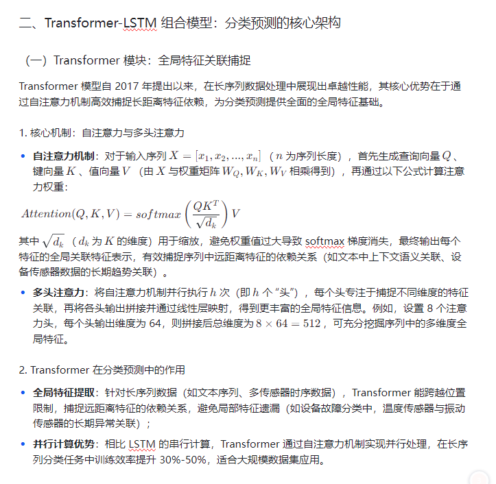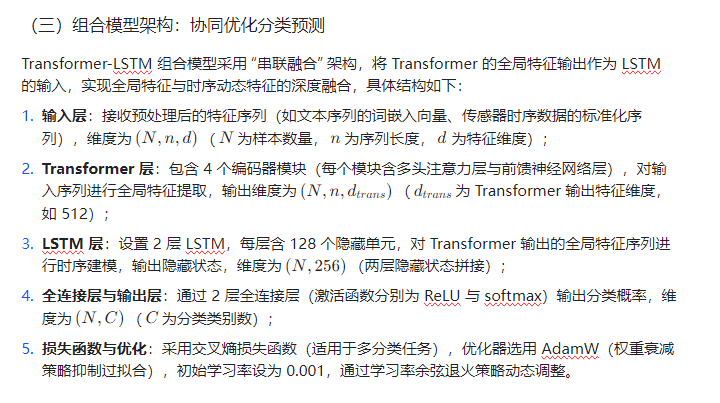 在自然语言处理、时序数据分类(如设备故障分类、用户行为分类)等领域,精准的分类预测是支撑决策的核心。随着数据复杂度提升,单一模型逐渐难以满足需求:Transformer 凭借自注意力机制擅长捕捉长距离特征关联,但对局部时序动态变化的建模能力不足;LSTM(长短期记忆网络)虽能有效处理时序数据的短期依赖关系,却在长序列全局特征提取上效率较低。因此,Transformer-LSTM 组合模型应运而生,通过融合两者优势,既利用 Transformer 挖掘全局特征关联,又借助 LSTM 捕捉时序动态特征,显著提升分类预测精度。