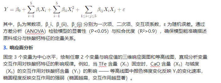 - 响应值(铁酸钙特征):选取 3 个核心特征指标,即铁酸钙含量(Y₁,%)、平均晶粒尺寸(Y₂,μm)、还原性指数(Y₃,%,间接反映铁酸钙还原性特征)。