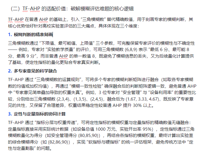 要理解 TF-AHP 在高校实验室评估中的应用必要性,需先明确当前评估工作面临的实际痛点,以及 TF-AHP 在解决这些痛点中的独特优势,这是方法选择与评估体系设计的根本依据。