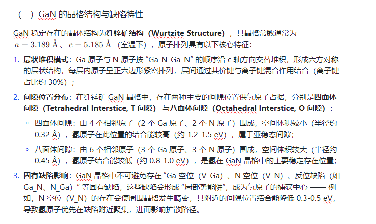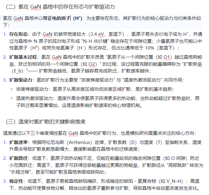 氮化镓(GaN)作为第三代宽禁带半导体材料的核心代表,凭借 “高击穿场强、高电子迁移率、耐高温” 等优异特性,在高频功率器件(如 5G 基站功放)、紫外光电探测器、新能源汽车逆变器等领域具有不可替代的应用价值。然而,氢作为 GaN 材料制备与器件工艺中难以避免的杂质(如 MOCVD 生长过程中氨气分解引入、封装工艺中环境氢渗透),其在 GaN 晶格中的扩散行为直接影响材料的电学性能 —— 例如,氢会与 GaN 中的施主杂质(如硅)形成中性复合物,导致载流子浓度下降;同时,氢扩散至器件界面会引发界面态密度增加,降低器件可靠性。温度作为调控原子扩散行为的核心外部参数,对氢在 GaN 晶格中的扩散路径、扩散速率与稳定性具有显著影响。因此,通过模拟方法揭示不同温度下氢在 GaN 晶格中的扩散机制,对优化 GaN 材料制备工艺、提升器件长期稳定性具有重要理论指导意义。本文将从 GaN 晶格结构与氢扩散基础、模拟方法选择、温度依赖性分析、模拟结果与应用四个维度,系统解析温度如何调控氢在 GaN 晶格中的扩散行为,为 GaN 基器件的性能优化提供科学依据。