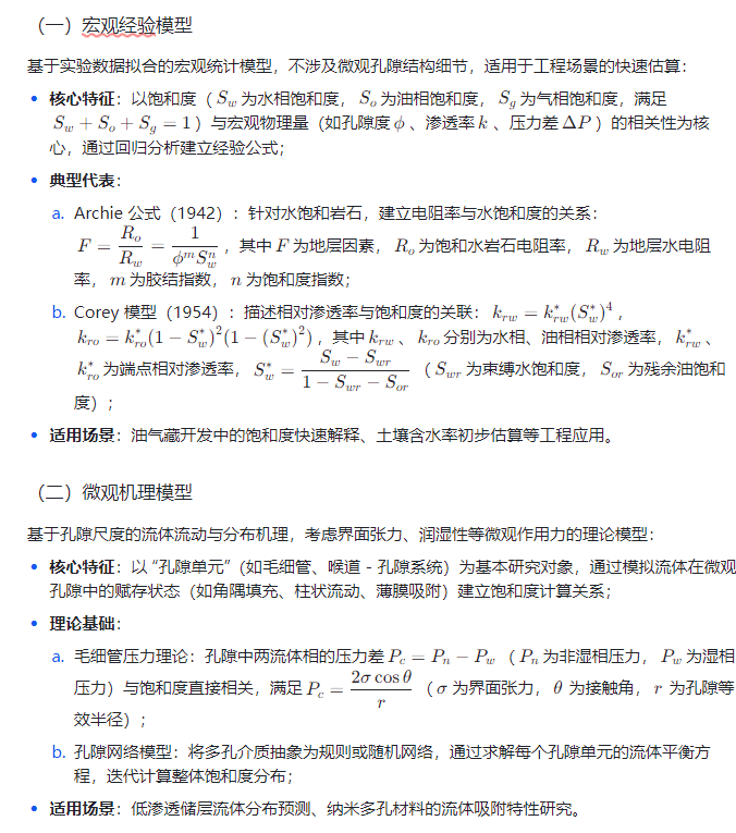 根据建模尺度、理论基础与适用场景的差异,多孔介质流体饱和度模型可分为三大类,各类模型的核心特征与适用范围存在显著差异:
