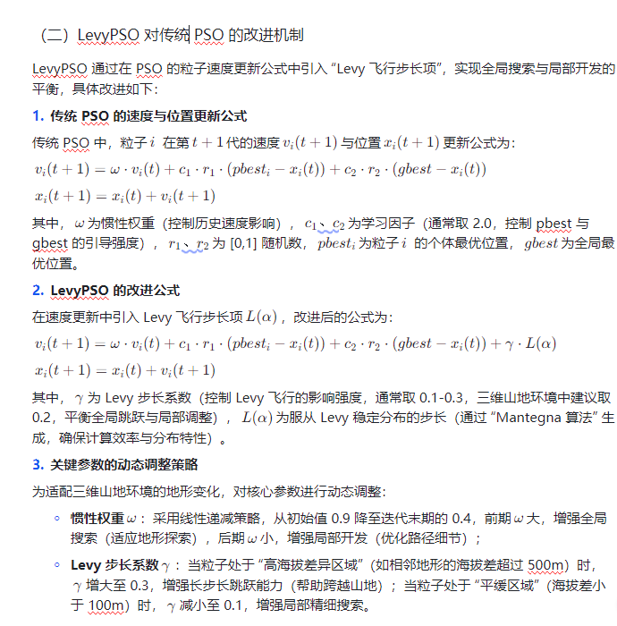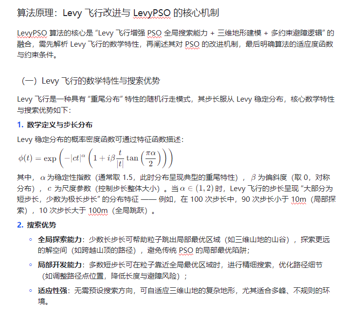 在无人机低空作业领域(如山地救援、森林防火巡检、电力线路维护),复杂三维山地环境因 “地形起伏剧烈、障碍物类型多样(山体、树木、输电塔)、环境动态变化(浓雾、阵风)” 等特性,对路径规划的 “安全性(避障)、经济性(路径长度)、平滑性(飞行稳定性)” 提出严苛要求。传统粒子群优化算法(PSO)虽在路径规划中应用广泛,但在三维山地环境下易陷入 “局部最优陷阱”(如被局部低海拔区域束缚,无法找到跨越山地的全局最优路径)与 “避障鲁棒性不足”(对不规则山体轮廓的碰撞检测精度低)等问题。而基于 Levy 飞行改进的粒子群算法(LevyPSO),通过将 Levy 飞行的 “长距离跳跃 + 短距离探索” 特性融入 PSO 的粒子位置更新,可显著增强算法的全局搜索能力,同时结合三维山地环境的地形建模与避障约束,实现无人机安全、高效的路径规划。本文将从三维山地环境特性、LevyPSO 算法原理、避障机制、完整实现流程到实验验证,全面解析该算法如何突破传统局限,为复杂山地环境下的无人机路径规划提供科学解决方案。