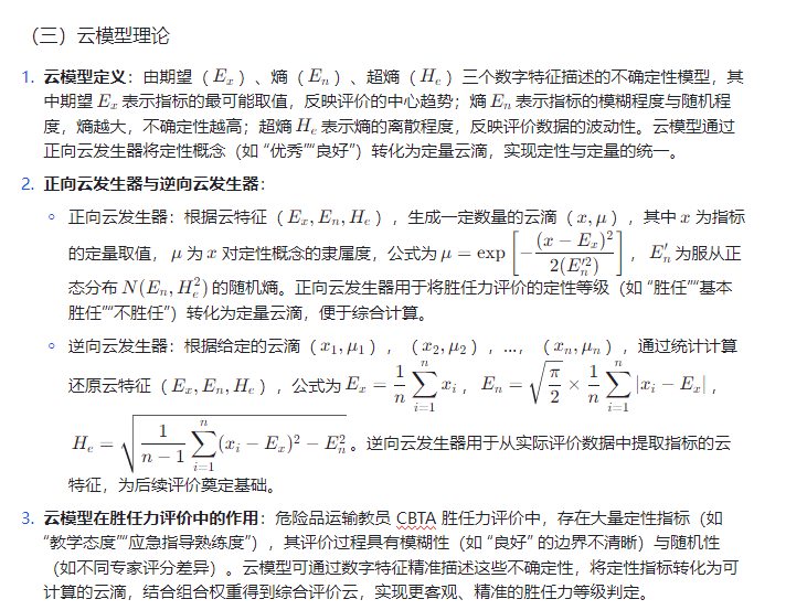 - 云模型评价体系构建:基于云模型理论,将定性指标(如教学态度、应急指导能力)转化为定量云滴,通过正向云发生器生成评价云,结合组合权重计算综合评价结果,实现模糊性与随机性的统一处理。