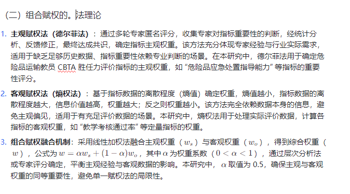- 德尔菲 - 熵权组合赋权法:通过德尔菲法收集专家对指标重要性的评分,确定主观权重;基于实际评价数据,采用熵权法计算客观权重;通过线性加权融合主观与客观权重,得到综合权重。