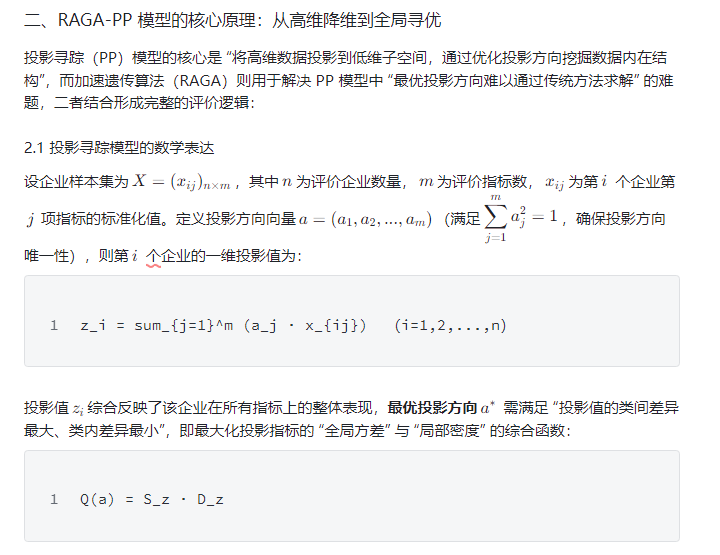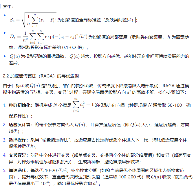 在 “双碳” 目标与高质量发展背景下,企业可持续发展能力评价需兼顾经济效益、环境责任、社会责任与创新能力四大维度,涉及资产负债率、碳排放量、员工福利、研发投入等数十项指标,形成 “高维、非线性、强耦合” 的评价体系。传统评价方法(如层次分析法 AHP、模糊综合评价)存在主观赋权偏差大、高维数据处理能力弱、难以捕捉指标隐性关联等问题,导致评价结果与企业实际发展水平脱节。而加速遗传算法投影寻踪模型(RAGA-PP) ,通过将高维评价指标投影到低维空间,结合遗传算法的全局寻优能力确定最优投影方向,实现 “客观赋权、降维解耦、精准刻画” 的协同优化,为企业可持续发展能力评价提供了兼具科学性与实用性的新方案。