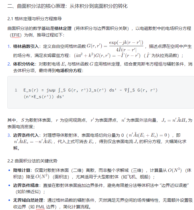 在电磁学、声学、光学等领域,散射问题(如电磁波遇障碍物的反射与绕射、声波在不规则界面的传播)普遍存在 “边界形态复杂(如非规则几何体、非均匀介质界面)、场分布耦合强(入射场与散射场相互作用)” 的核心难题。传统求解方法(如分离变量法、有限差分法)要么仅适用于规则边界(如球体、无限平面),要么需对整个求解域离散(计算量大、边界条件处理繁琐)。而曲面积分法通过 “仅对散射体表面离散,将体积分转化为面积分” 的核心逻辑,大幅减少计算量,同时精准刻画复杂边界的场分布特征,成为解决中高频段散射问题的主流数值方法,尤其在雷达目标探测、电磁兼容(EMC)设计、声呐技术等领域具有不可替代的优势。