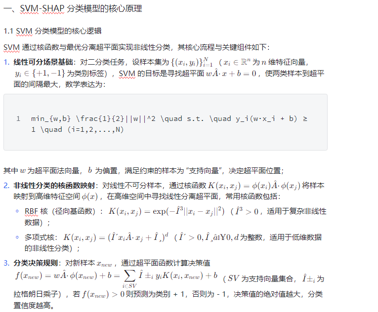 在信用风险评估、疾病诊断、图像识别等分类场景中,支持向量机(SVM)凭借其在高维数据、非线性分类任务中的优异性能(通过核函数映射将线性不可分问题转化为高维空间线性可分问题),成为经典且常用的分类模型。然而,SVM 的核心逻辑 —— 通过寻找最优分离超平面实现分类 —— 存在显著的 “黑箱” 局限:仅能输出样本的类别标签与置信度,无法回答 “哪些特征主导了该分类决策”“特征取值如何影响分类结果” 等关键问题。这种局限性在高风险、高监管领域(如金融信贷审批、医疗疾病诊断)尤为突出:决策缺乏可解释性会降低用户信任,难以满足合规要求,且无法通过特征分析优化模型性能。而SHAP(SHapley Additive exPlanations)方法基于博弈论中的 Shapley 值原理,能为 SVM 分类模型的每个特征分配 “公平且合理” 的贡献值,从全局(所有样本的特征重要性)与局部(单个样本的特征影响)两个维度解析分类决策过程,完美弥补 SVM 的可解释性短板,构建 “高精度分类 + 透明化解释” 的双优模型。