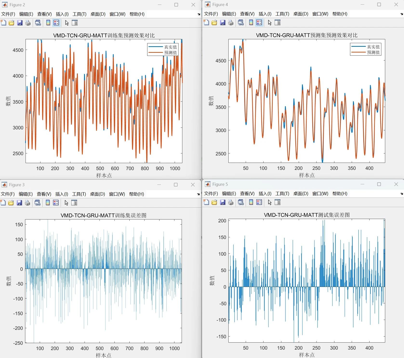 在电力负荷预测(风速、温度、历史负荷多变量耦合)、交通流量预测(车流量、降雨量、时段特征联动)、工业过程监控(温度、压力、流量时序波动)等场景中,多变量时序数据存在 “非线性强、多尺度特征叠加、长周期依赖复杂” 三大核心难点。传统单模型(如 GRU、TCN)面临双重局限:一是难以拆解多尺度特征(如电力负荷的日内波动与季节变化叠加),导致局部细节丢失;二是对关键时序节点(如用电高峰、交通拥堵时段)的敏感度不足,预测精度受限。而VMD-TCN-GRU-MATT 融合架构,通过 “VMD 分解多尺度特征 + TCN 捕捉局部依赖 + GRU 建模长周期关联 + MATT 聚焦关键信息” 的协同机制,同时突破特征分解与时序建模的瓶颈,为多变量时序预测提供高精度解决方案。