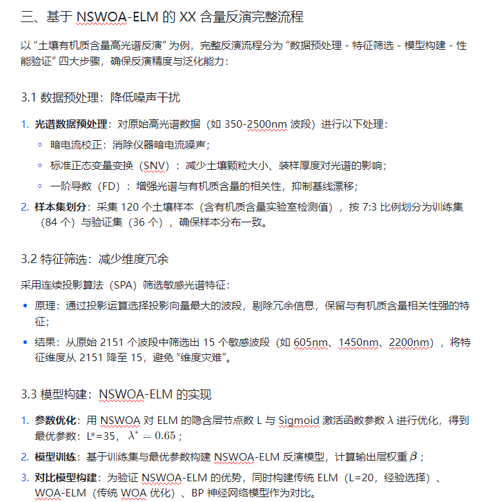 因此,构建 “特征优化 - 参数自适应寻优 - 高精度建模” 一体化的智能反演方法,成为突破 XX 含量反演技术瓶颈的关键路径,而 NSWOA-ELM 算法正是通过改进鲸鱼优化算法(NSWOA)的全局寻优能力与极限学习机(ELM)的快速建模优势,为这一需求提供高效解决方案。