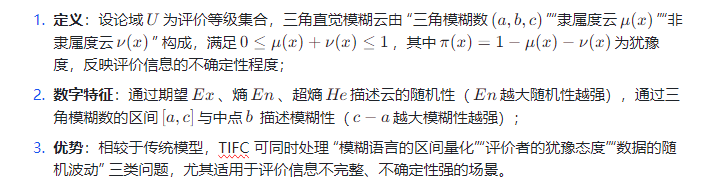 三角直觉模糊云模型(Triangular Intuitionistic Fuzzy Cloud, TIFC)融合三角模糊数的 “区间量化能力”、直觉模糊集的 “犹豫度表达” 与云模型的 “随机性刻画” 三大优势,为多属性评价的不确定性处理提供了更精准的数学工具。