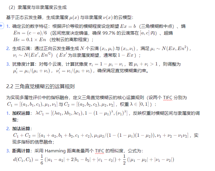 三角直觉模糊云是在传统云模型基础上,引入三角模糊数描述模糊区间、直觉模糊集描述隶属度与非隶属度,其核心定义与特性如下: