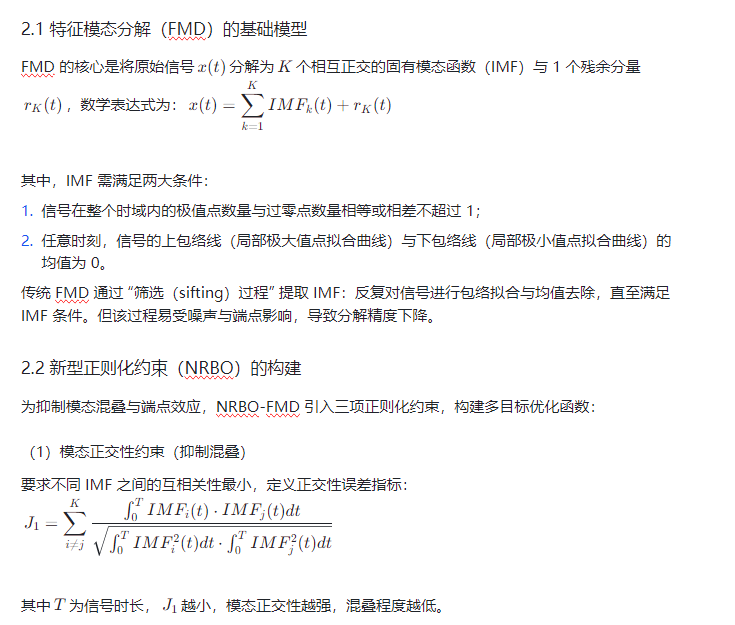 NRBO-FMD(新型正则化优化特征模态分解)方法的核心思路是:通过牛顿 - 拉夫逊算法的快速迭代特性优化模态筛选过程,结合新型正则化约束(NRBO)抑制混叠与端点效应,实现 “高精度 - 高效率 - 强鲁棒性” 的信号分解。