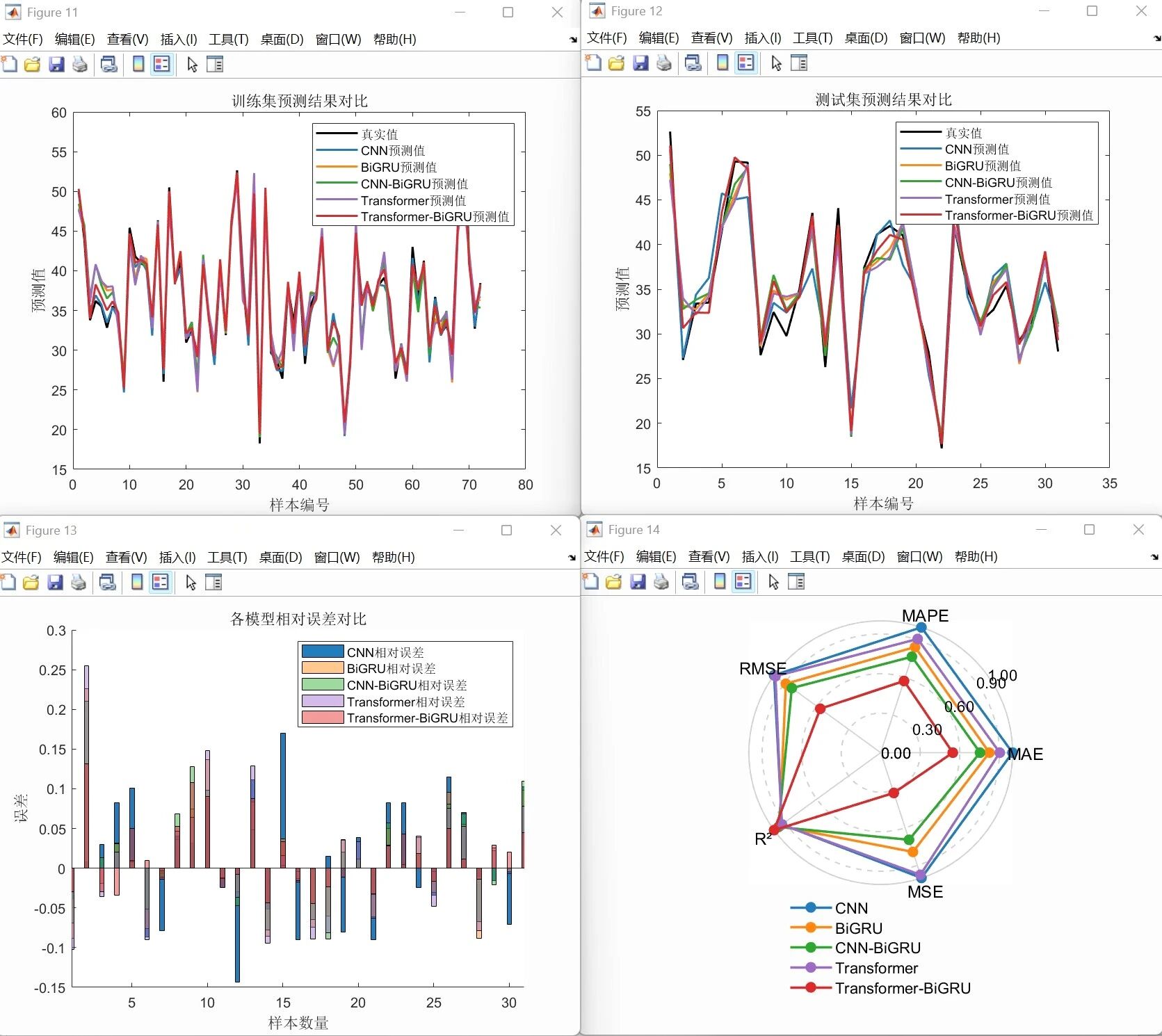 在工业参数预测(如设备温度趋势)、环境监测(如 PM2.5 浓度变化)、能源调度(如电力负荷波动)等回归场景中,模型的 “时序捕捉能力”“局部特征提取效率”“长周期依赖建模精度” 直接决定预测效果。当前主流的深度学习回归模型中,CNN 擅长局部特征提取,BiGRU 专注双向时序依赖,Transformer 依靠自注意力突破长时序限制,而 Transformer-BiGRU、CNN-BiGRU 等组合模型则试图融合多模型优势。