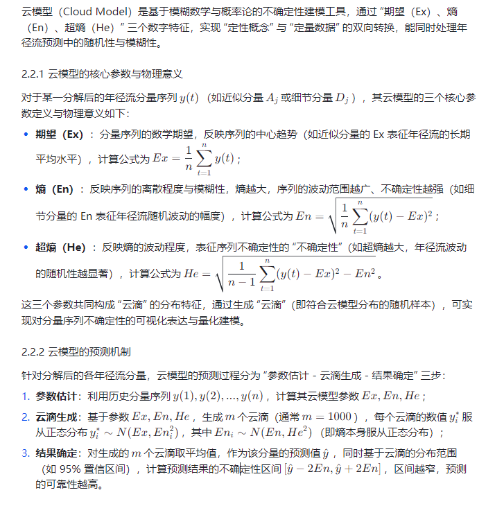 这些难点使得传统预测方法在年径流预测中难以满足 “高精度、强鲁棒、可解释” 的需求,而小波云模型通过 “多尺度分解 + 不确定性建模” 的协同,为突破上述瓶颈提供了技术支撑。