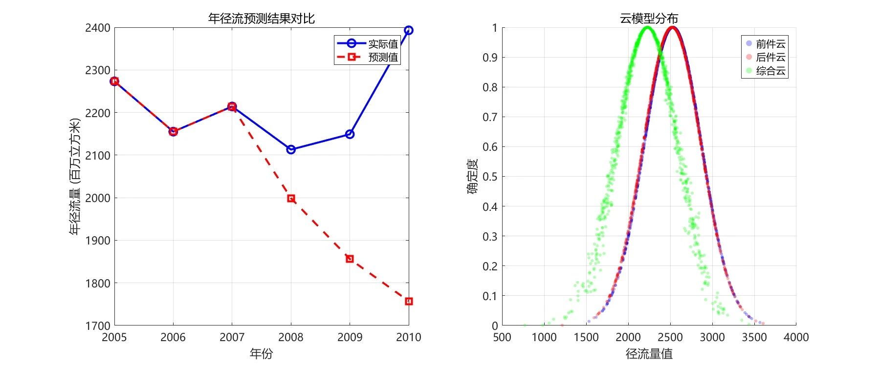 - 多分量预测结果融合:对各分量的云模型预测结果进行小波重构,将不同尺度的预测信息融合为最终的年径流预测值,同时输出预测结果的不确定性区间(基于云模型的熵与超熵计算),为水资源决策提供 “确定性结果 + 不确定性范围” 的双重支撑。