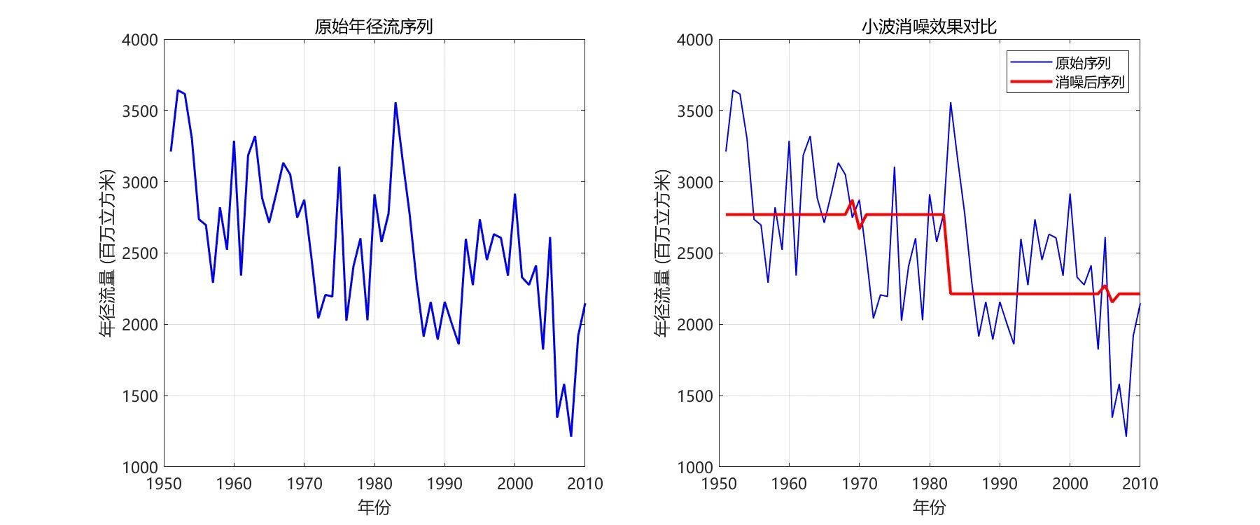 - 小波多尺度分解:利用小波分析的多分辨率特性,将原始年径流序列分解为不同尺度的低频近似分量(反映序列的趋势性、周期性等平稳特征)与高频细节分量(反映序列的随机波动、突变等非平稳特征),实现 “复杂序列简化”,为后续精准建模奠定基础;