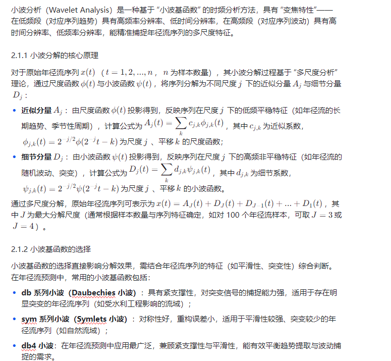 小波分析(Wavelet Analysis)是一种基于 “小波基函数” 的时频分析方法,具有 “变焦特性”—— 在低频段(对应序列趋势)具有高频率分辨率、低时间分辨率,在高频段(对应序列波动)具有高时间分辨率、低频率分辨率,能精准捕捉年径流序列的多尺度特征。