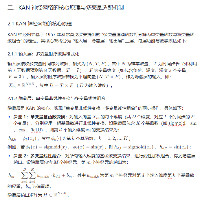 - 非线性拟合能力强:基于科尔莫戈罗夫定理,KAN 通过单变量基函数(如 sigmoid、ReLU、三角函数)对每个输入变量进行非线性变换,再通过多变量线性组合整合信息,无需复杂的多层卷积或循环结构,即可高效拟合多变量间的非线性关联。例如,在电力负荷预测中,KAN 可通过温度变量的 sigmoid 变换与负荷变量的 ReLU 变换,精准捕捉 “温度超过 30℃后负荷非线性激增” 的规律;