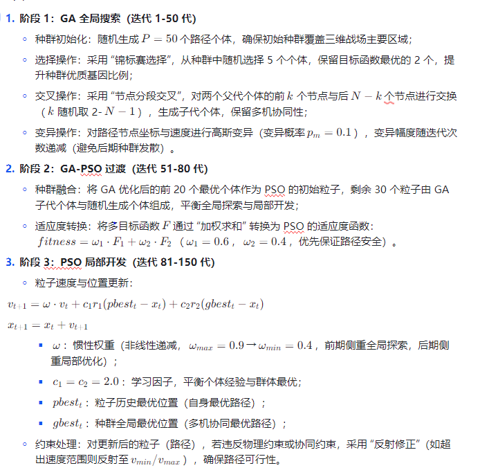 在现代信息化战争中,多无人机协同作战需在复杂三维战场环境(含山脉、雷达站、防空火力等动态威胁)中完成侦察、打击、支援等任务,核心挑战在于多目标路径优化:既要规避静态障碍与动态威胁,又要实现多机时间协同(如同步抵达目标区域、分阶段任务衔接),同时满足无人机续航、机动性等物理约束。传统路径规划算法(如单一 GA 或 PSO)存在 “局部最优陷进”“多机协同性差” 等缺陷,难以适配战场高动态、强约束场景。
