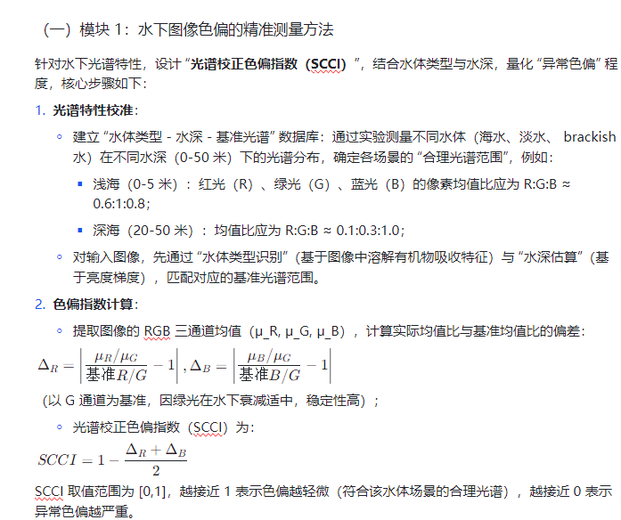 - 色偏量化难:传统色偏评估(如灰度世界假设偏差)未考虑水下光谱特性,例如将 “蓝绿色偏” 简单归为色偏异常,忽略深水区蓝光主导是水体物理特性导致的 “合理偏差”,易误判评估结果;