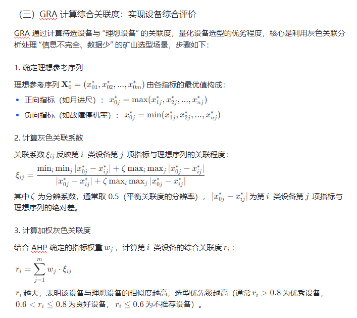 传统选型方法存在明显局限:单纯 AHP 法虽能分层确定权重,但无法处理指标模糊性;GRA 法可计算设备与理想方案的关联度,但权重依赖主观设定;云模型擅长处理模糊信息,却缺乏系统的指标权重计算机制。而GRA-AHP - 云模型融合方法,通过 AHP 确定科学权重、云模型量化模糊指标、GRA 计算综合关联度,形成 “权重 - 模糊 - 关联” 三位一体的评价体系,有效破解上述难题。本文以地下煤矿掘进机与露天铁矿破碎机选型为例,构建完整评价框架,验证方法的科学性与实用性。