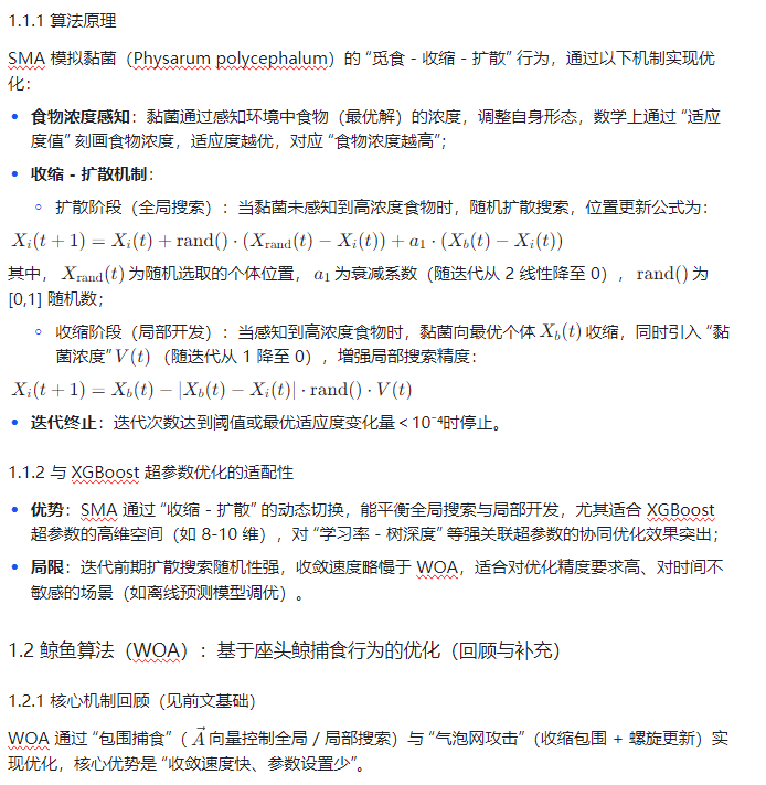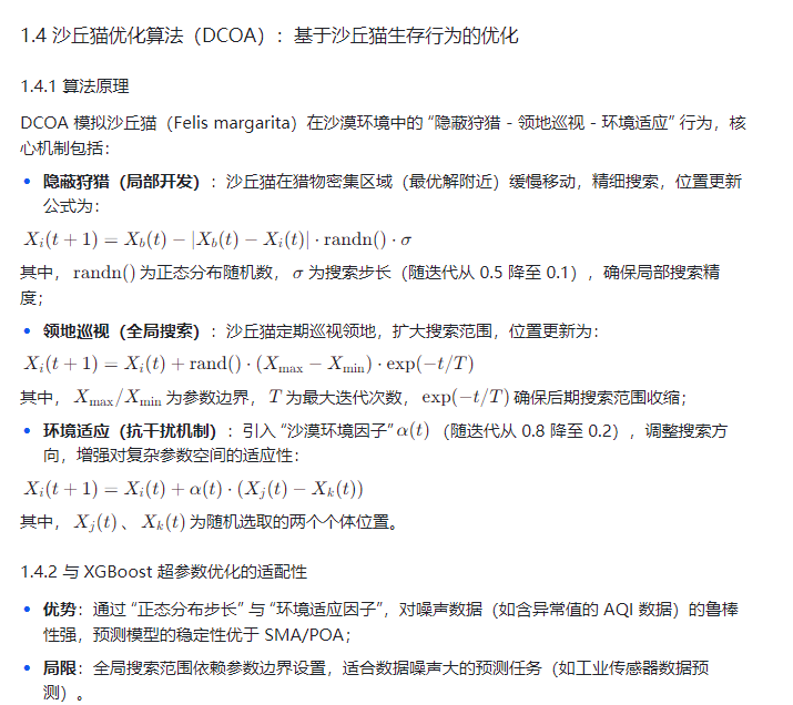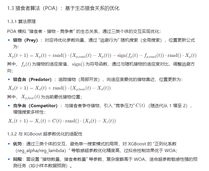 XGBoost 作为高效的集成学习模型,在回归预测(如 AQI、负荷预测)与分类任务(如故障诊断、风险评估)中应用广泛,但超参数(学习率、树深度等)的合理配置直接决定模型性能。传统调优方法(网格搜索、随机搜索)存在 “维度灾难” 与 “局部最优” 问题,而群智能算法凭借 “全局搜索、自适应优化” 特性,成为 XGBoost 超参数优化的理想工具。本文系统对比黏菌算法(SMA)、鲸鱼算法(WOA)、猎食者算法(POA)、沙丘猫优化算法(DCOA)的核心机制,详细拆解各算法优化 XGBoost 的实现流程,并通过预测性能对比,为不同场景下的算法选择提供依据。