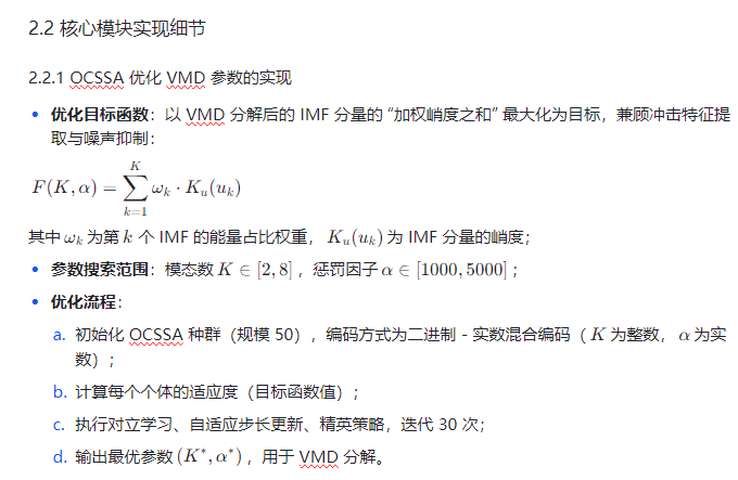 - 自适应信号分解模块(OCSSA-VMD):通过 OCSSA 优化 VMD 参数,实现故障信号的自适应多尺度分解;
