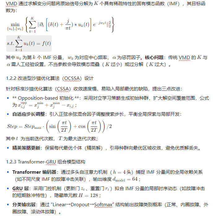 轴承故障诊断是保障旋转机械安全运行的核心技术,传统方法存在 “特征提取依赖经验、模型难以捕捉多尺度故障信息” 的瓶颈。本文提出一种融合改进型沙猫优化算法(OCSSA)、变分模态分解(VMD)与 Transformer-GRU 的组合诊断模型:首先通过 OCSSA 自适应优化 VMD 的关键参数(模态数
