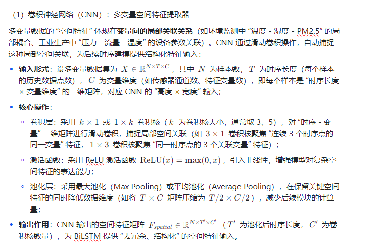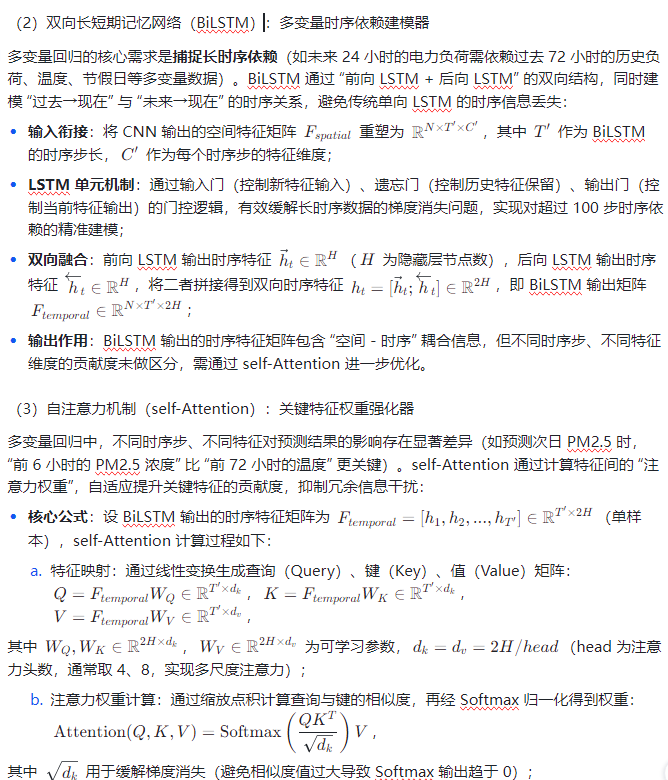 在多变量回归场景中(如工业过程参数预测、环境污染物浓度预测、能源负荷预测),数据往往同时包含空间关联特征(如多传感器通道的局部耦合关系)与长时序依赖特征(如历史数据对未来趋势的影响),且不同特征对预测结果的贡献度存在显著差异。传统回归模型(如 CNN、BiLSTM)虽能分别处理单一类型特征,但难以同时精准捕捉 “空间 - 时序” 耦合关系,且无法自适应聚焦关键特征。基于此,CNN-BiLSTM-self-Attention 多变量回归模型通过 “CNN 提取空间特征→BiLSTM 建模时序依赖→self-Attention 强化关键特征权重” 的三层协同架构,实现多变量数据的高精度回归预测,为复杂场景下的连续值预测问题提供高效解决方案。
