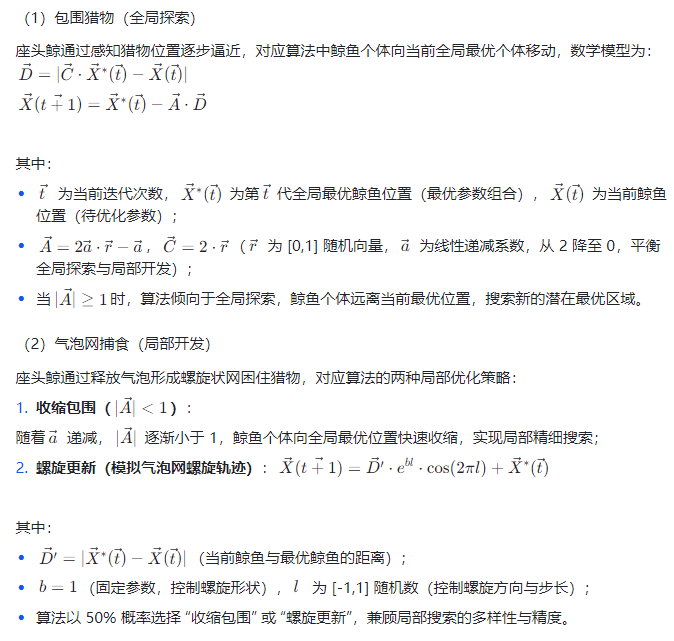 WOA 模拟座头鲸的两种核心捕食行为 ——“包围猎物” 与 “气泡网捕食”,将待优化参数(如 BP 的权重、阈值)编码为 “鲸鱼个体”,通过迭代更新实现全局最优搜索:
