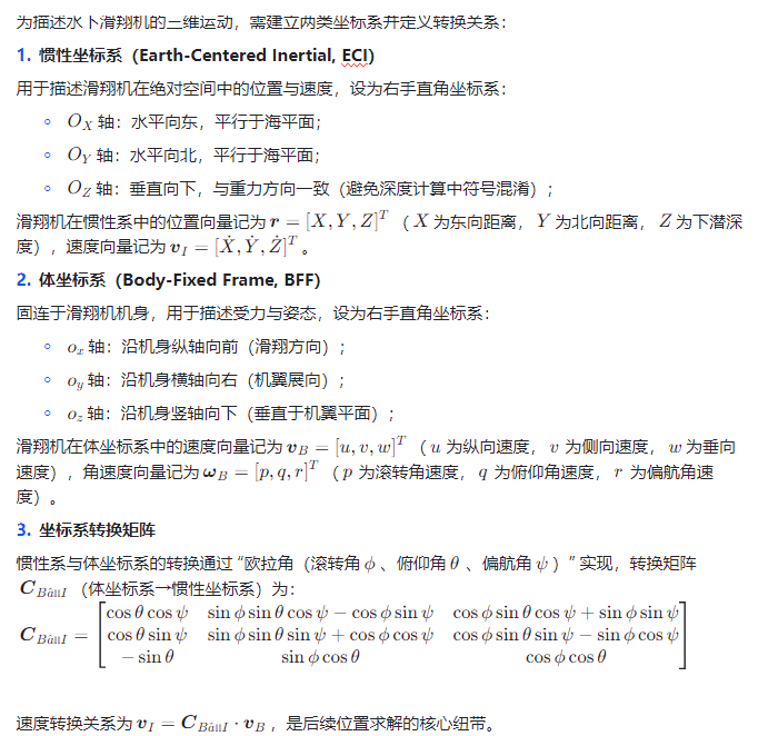 水下滑翔机的运动本质是 “力与力矩作用下的刚体运动”,需先明确三维空间中的坐标系定义、受力分析,再推导对应的非线性常微分方程组(ODEs),为 ODE45 求解提供数学基础。
