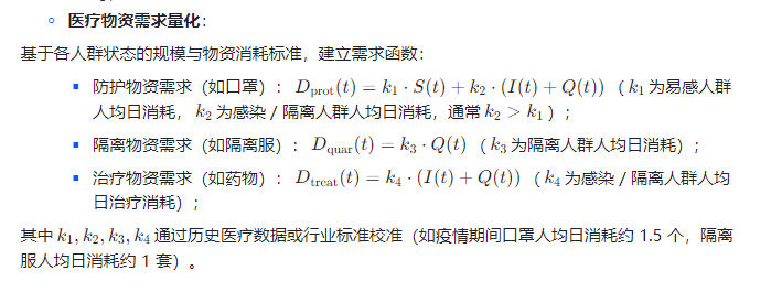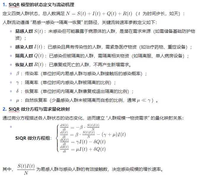 在此背景下,基于 SIQR 模型的动态决策系统应运而生:通过 SIQR 传染病模型(Susceptible- Infected-Quarantined-Recovered,易感 - 感染 - 隔离 - 恢复)量化需求端的感染人群动态,预测医疗物资(如隔离设备、治疗药物)的实时需求;同时构建 “多阶段制造交付模型”,将供给端的生产、运输、分配环节转化为可量化的动态变量;最终通过动态决策系统实现 “需求预测→供给调整→资源优化” 的闭环,确保医疗物资在多阶段流程中精准匹配需求,提升公共卫生事件的应急响应效率。
