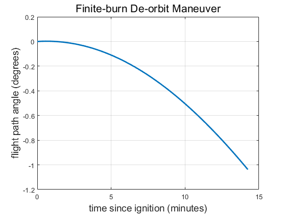该脚本可用于计算航天器从初始圆轨道或椭圆地球轨道完成降轨所需的最优有限推力推进机动。仿真假设推进机动为连续、共面运动,并建模为一系列离散化的转向角。该脚本在满足用户定义的轨道边界条件的同时,力求最小化有限推力的作用时长。由于机动过程是连续的,因此这一目标等价于最小化机动所需的推进剂消耗量。
