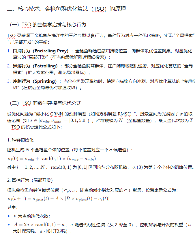 金枪鱼群优化算法(Tuna Swarm Optimization, TSO) 是 2022 年提出的新型群智能优化算法,灵感源于金枪鱼的 “围捕”“巡游”“冲刺” 三种典型行为,具有全局寻优能力强、收敛速度快、参数设置少的优势。将 TSO 用于 GRNN 光滑因子的自适应优化,构建 TSO-GRNN 预测模型,可突破传统参数优化的瓶颈,显著提升 GRNN 的预测精度与稳定性。本文将从模型原理、构建流程、工程案例三方面,系统解析 TSO-GRNN 预测模型的设计逻辑与实用价值。