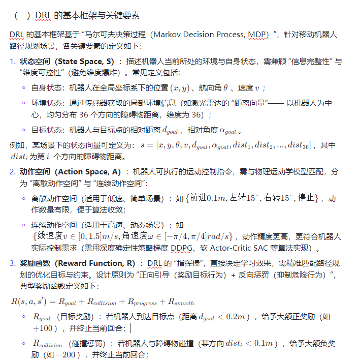DRL 结合了深度学习(Deep Learning, DL)的 “环境特征提取能力” 与强化学习(Reinforcement Learning, RL)的 “序贯决策能力”,通过 “智能体(机器人)- 环境交互 - 奖励反馈” 的闭环,自主学习最优路径策略。其核心逻辑与移动机器人路径规划的需求高度契合:机器人作为 “智能体”,在 “环境”(如室内空间、工业园区)中执行 “动作”(如前进、左转、右转),根据 “状态”(如自身位置、障碍物距离)获得 “奖励”(如靠近目标得正奖、碰撞得负奖),最终学习到 “从状态到动作的最优映射”(即路径策略)。