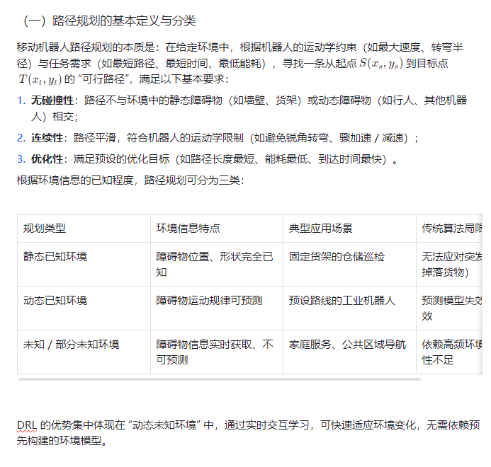 在深入 DRL 算法前,需先明确移动机器人路径规划的核心需求与场景约束,这是后续算法设计与优化的前提。