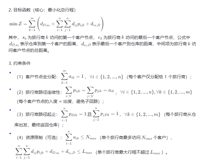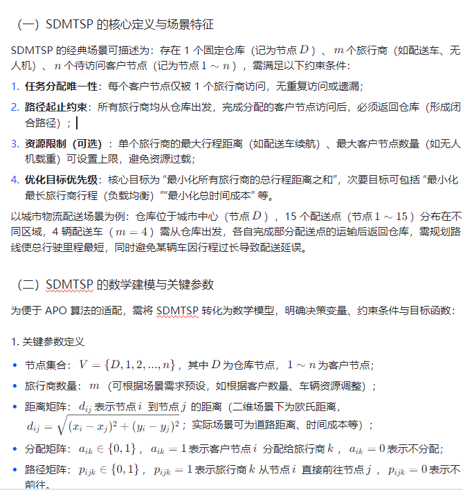 在深入 APO 算法前,需先明确 SDMTSP 的核心约束与优化目标,这是算法设计与适配的基础,同时为 “数据集更换” 与 “起点调整” 提供清晰的问题边界。