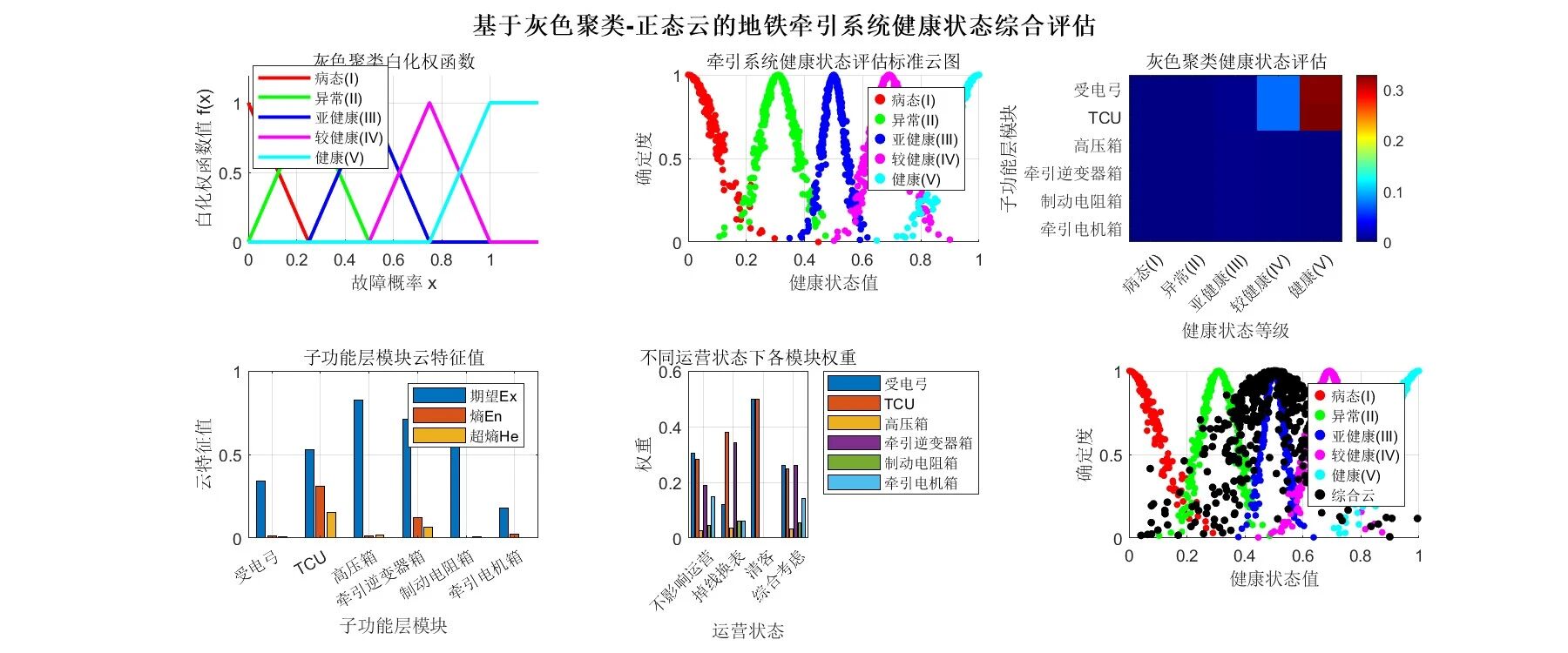 灰色聚类算法擅长小样本、贫信息场景下的分类评估,可有效利用有限监测数据划分健康等级;正态云模型则能将 “定性概念”(如 “振动偏大”)与 “定量数据”(如振动加速度值)精准映射,处理模糊性与随机性并存的不确定性问题。二者融合构建的综合评估模型,可实现地铁牵引系统健康状态的 “精准分类 - 不确定性量化 - 多指标协同” 评估,为运维决策提供科学依据。本文将从评估指标体系构建、模型原理、实现流程到案例验证,完整解析该方法的技术路径。