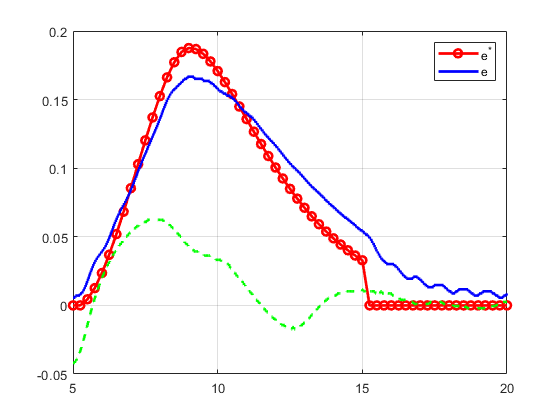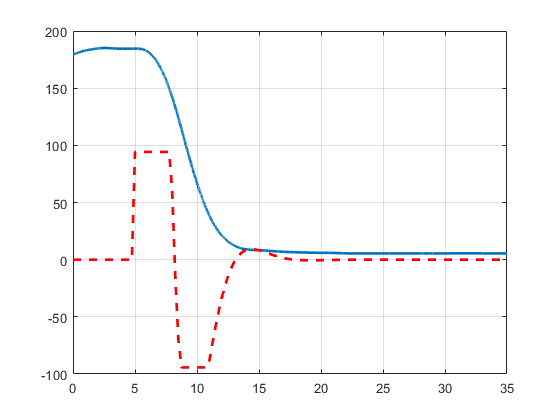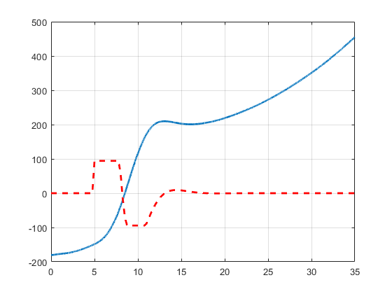 plot(f.ans(1,:),f.ans(2,:), t,180*u,'r--', 'LineWidth',2); grid on;
