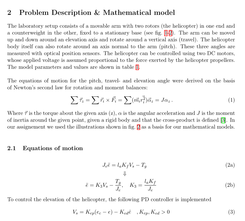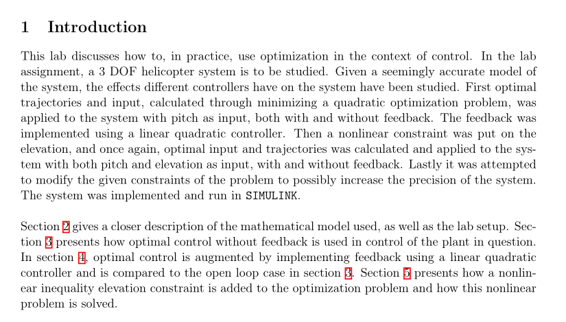 需将优化算法与控制理论相结合,用于控制由 PID 控制器稳定的三自由度(DOF)固定式直升机机械臂。首先基于线性化模型计算最优轨迹,随后将其分别应用于存在线性约束的开环系统,以及存在线性与非线性约束的闭环系统。反馈控制通过实现线性二次控制器来完成。本报告旨在说明数学优化如何应用于实际控制场景,反馈控制如何提升简化模型的使用效果,以及当线性化模型加入非线性约束后该如何进行控制。