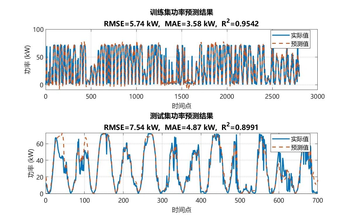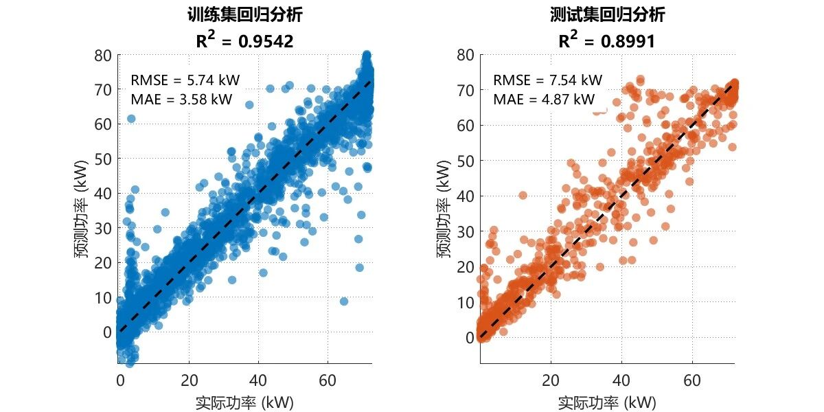 训练集 - 均方根误差: 5.738 kW, 平均绝对误差: 3.581 kW, 决定系数: 0.9542