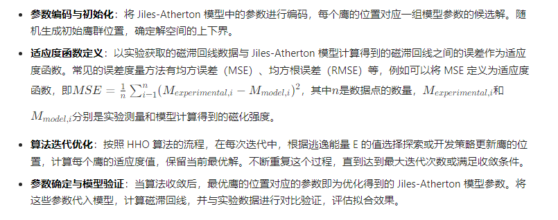 哈里斯鹰算法(Harris Hawk Optimization, HHO)是一种新兴的自然启发式优化算法,灵感来源于哈里斯鹰在自然界中独特的协作捕食行为,可用于优化 Jiles-Atherton 模型的磁滞回线拟合,提高模型参数辨识的准确性。以下是具体介绍:
