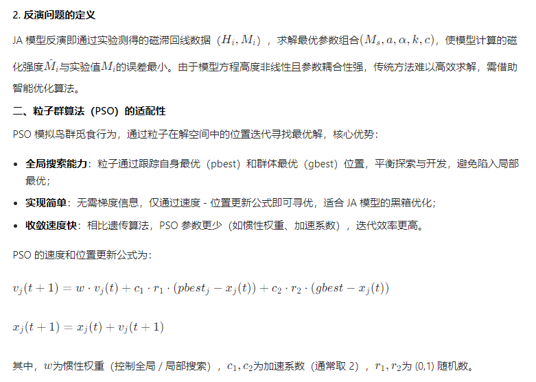 基于粒子群算法(PSO)优化 Jiles-Atherton(JA)磁滞模型的反演(PSO-JA),是通过 PSO 的群体智能搜索能力求解 JA 模型中关键参数,实现对铁磁材料磁滞回线的精准拟合,解决传统参数辨识方法(如最小二乘法)易陷入局部最优的问题。以下是具体技术框架与实现流程: