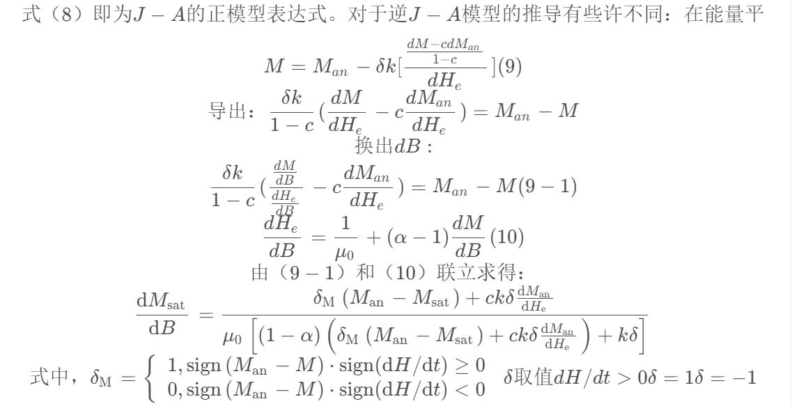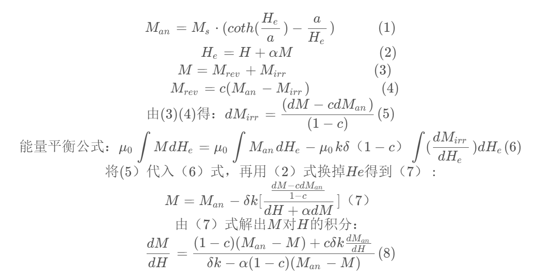 JA 模型基于磁畴壁运动的物理机制,用一组组微分方程描述磁化强度M与外加磁场H的非线性关系,核心参数包括 5 个物理量: